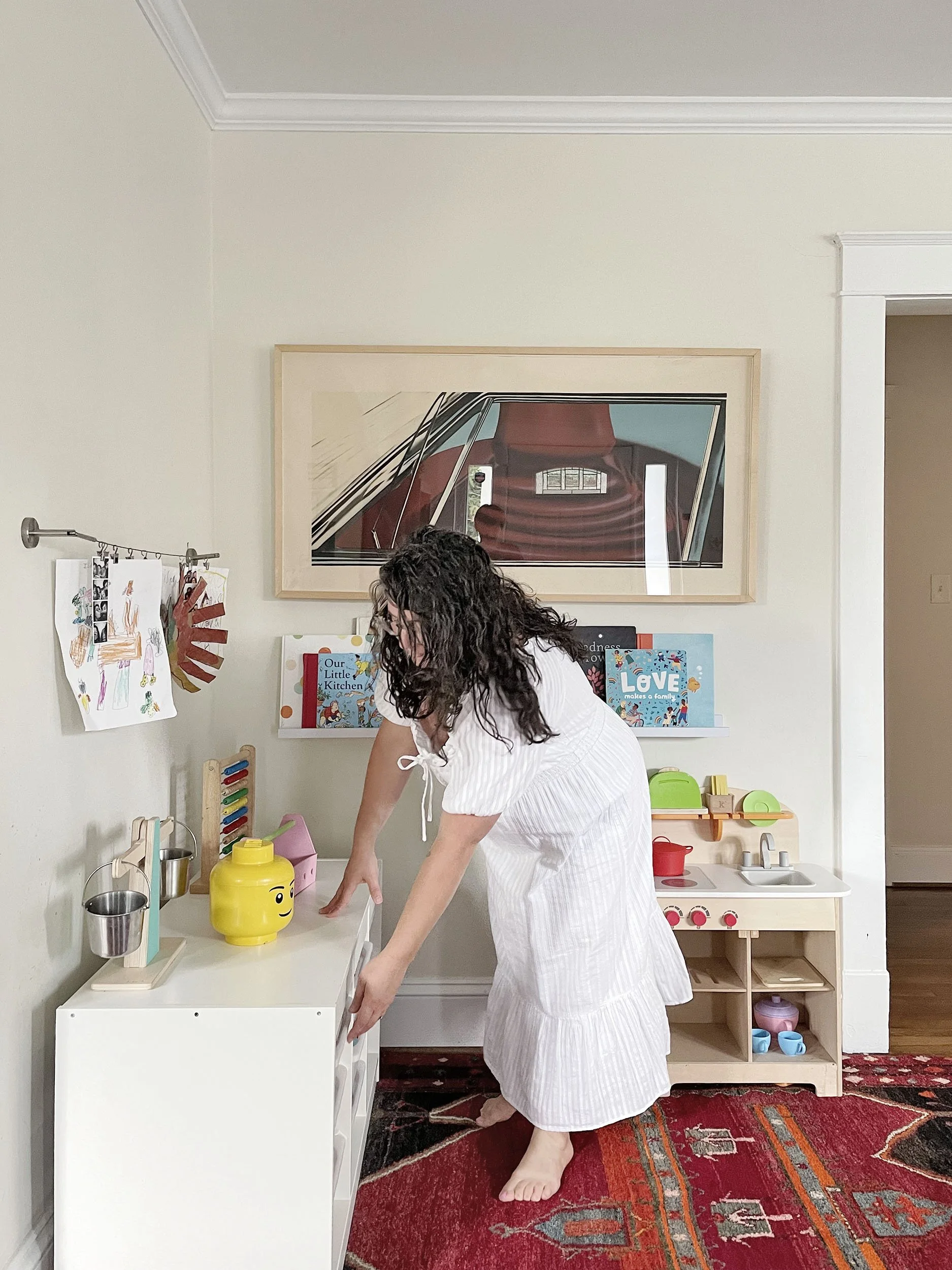 A: The realization that we don’t need all of the toys. My children had ten or so accessories that came with their play kitchen and I would get so frustrated picking all of them up. I decided to reduce those toys to five, making it easier and less frustrating to put away. It’s also been important to set limits to toy intake and boundaries with incoming toys/gifts.