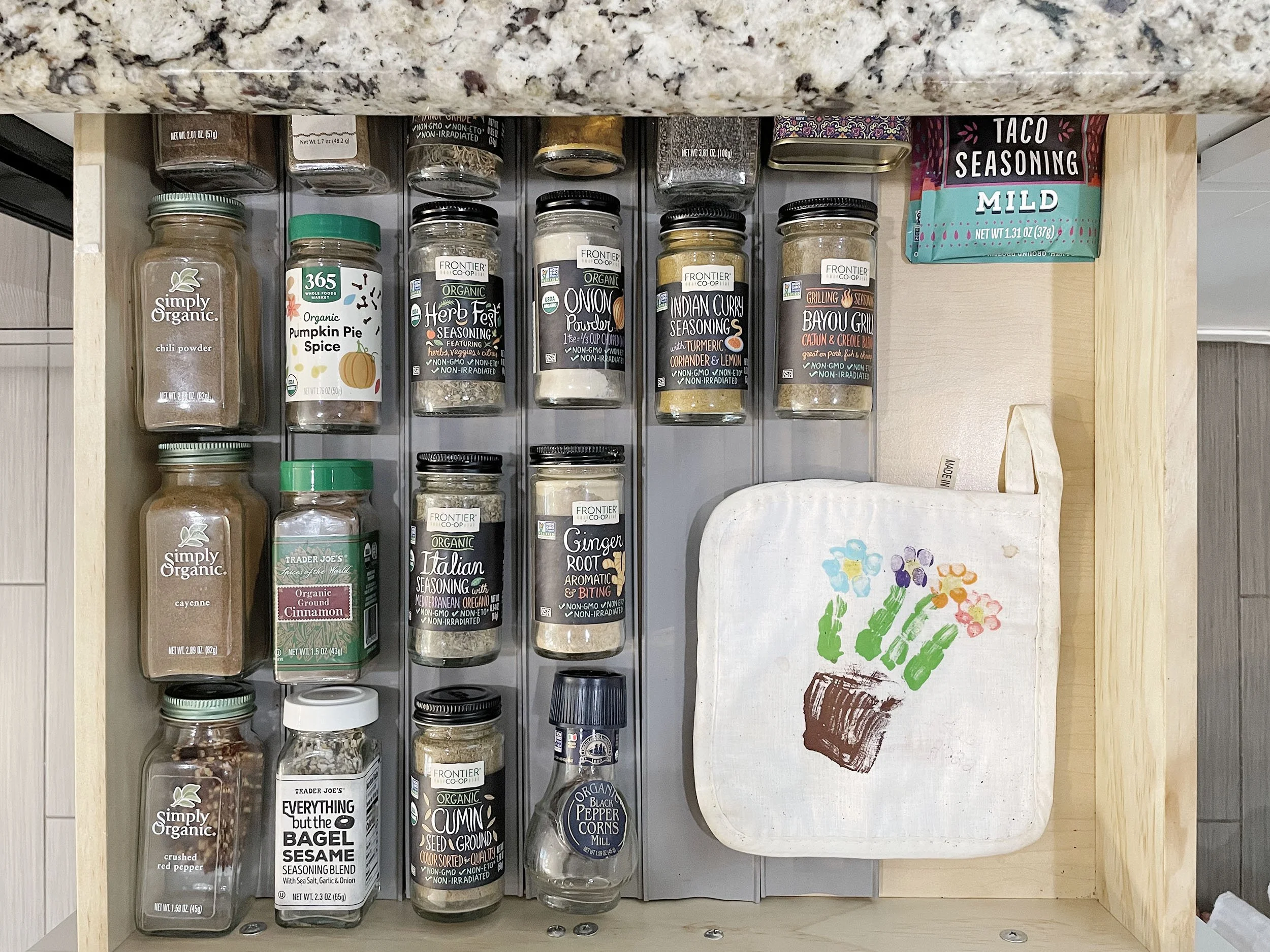 Alex’s pro tip: “If you don’t want to buy matching spice jars, you can buy the same brand from the store so they all match. I am in the process of getting all Frontier Co-op brand spices.”