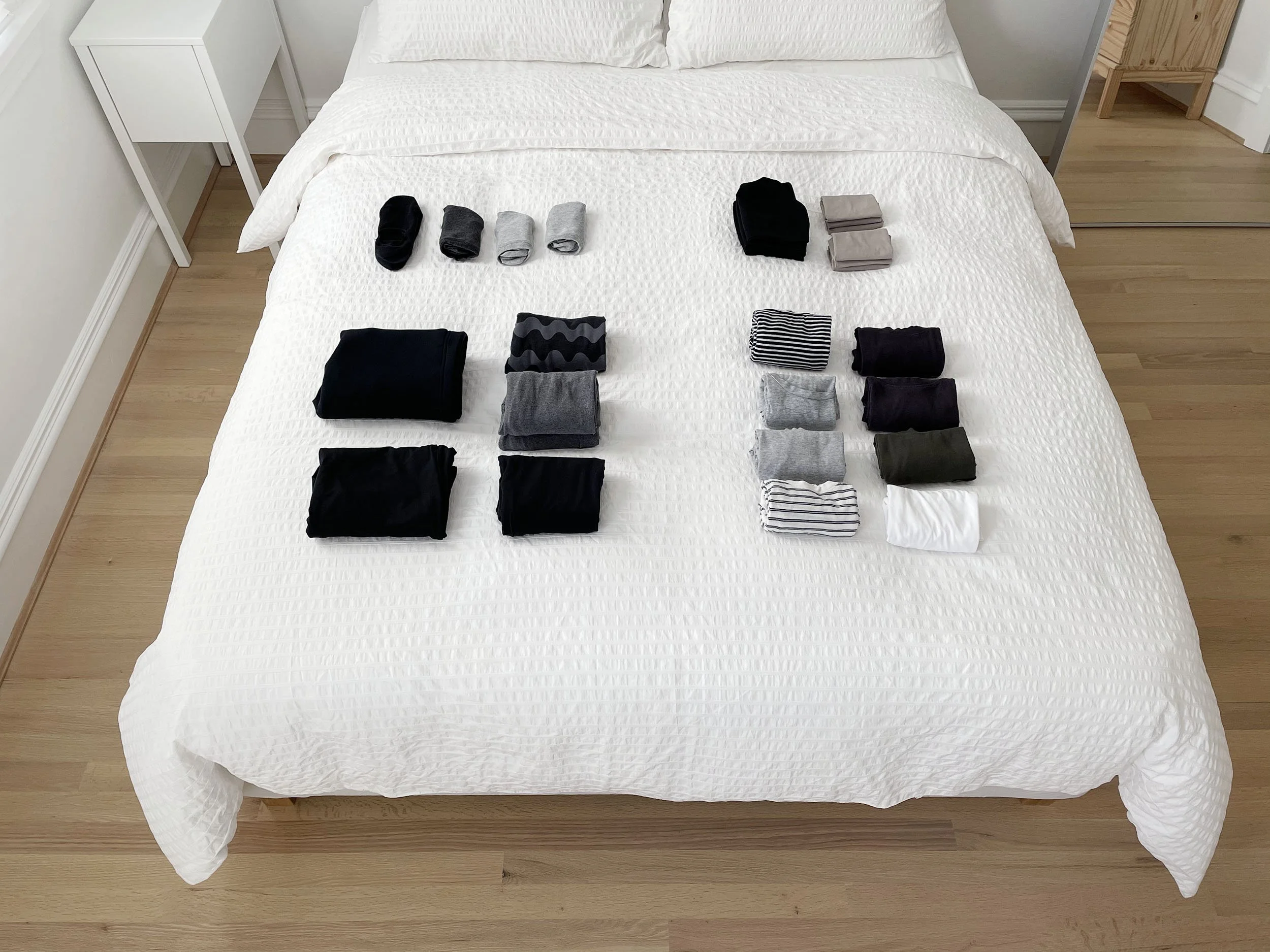 This particular post highlights folded clothing, but I do have some hanging items as well (you can see the hangers I selected for my closet here). Generally speaking, my hanging clothing is what I call my “capsule wardrobe”—dressier tailored pieces I would put on to go out or to an important meeting/event. The clothing I fold is what I call my “uniform”—staple pieces I wear on a more daily basis (and for work) and often purchase in multiples.