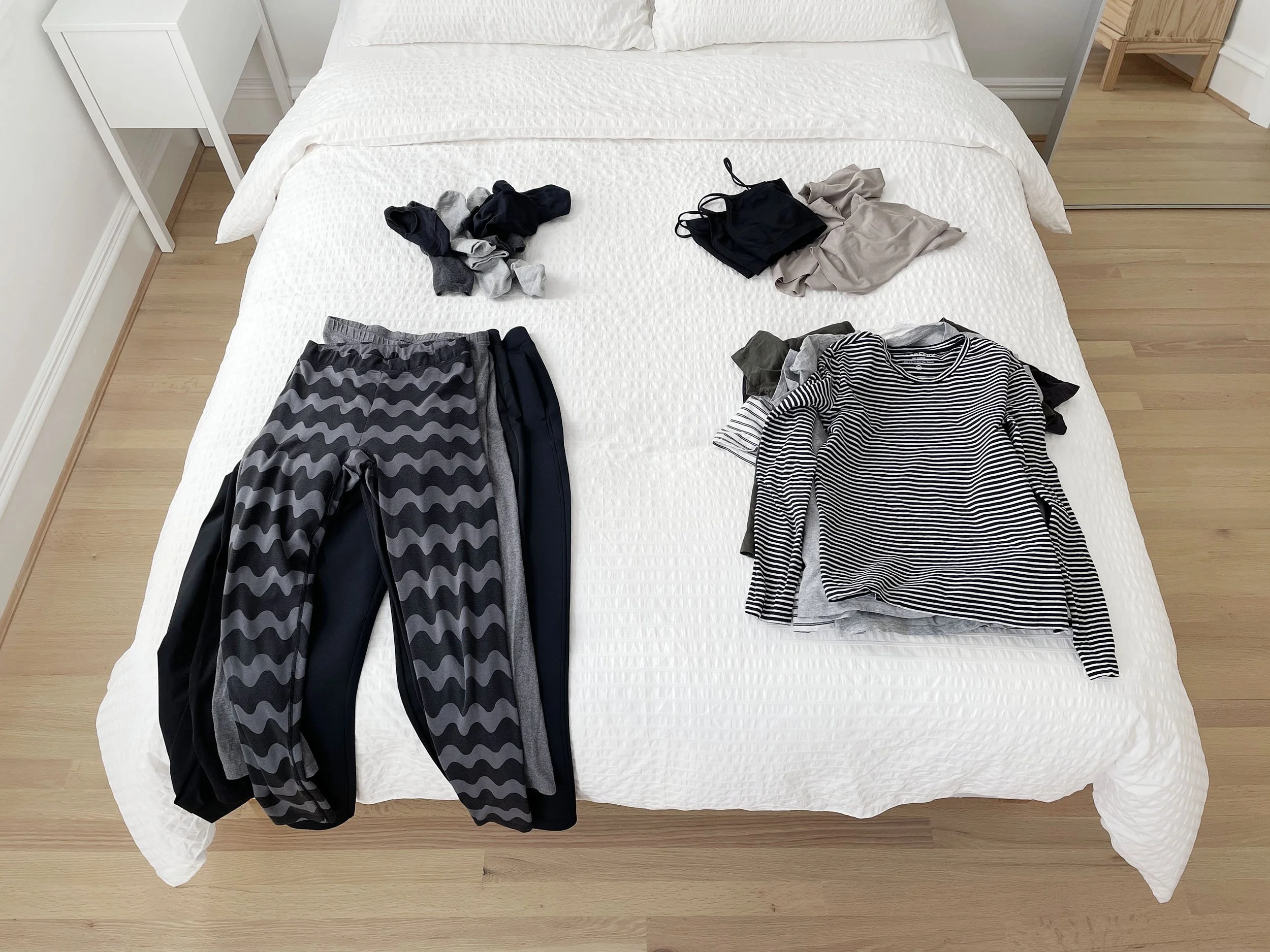 When you’re sorting clothing onto the bed, group like items together. This way, when you’re ready to fold you can get into a good rhythm. I typically make piles for undergarments, socks, tops, and bottoms.