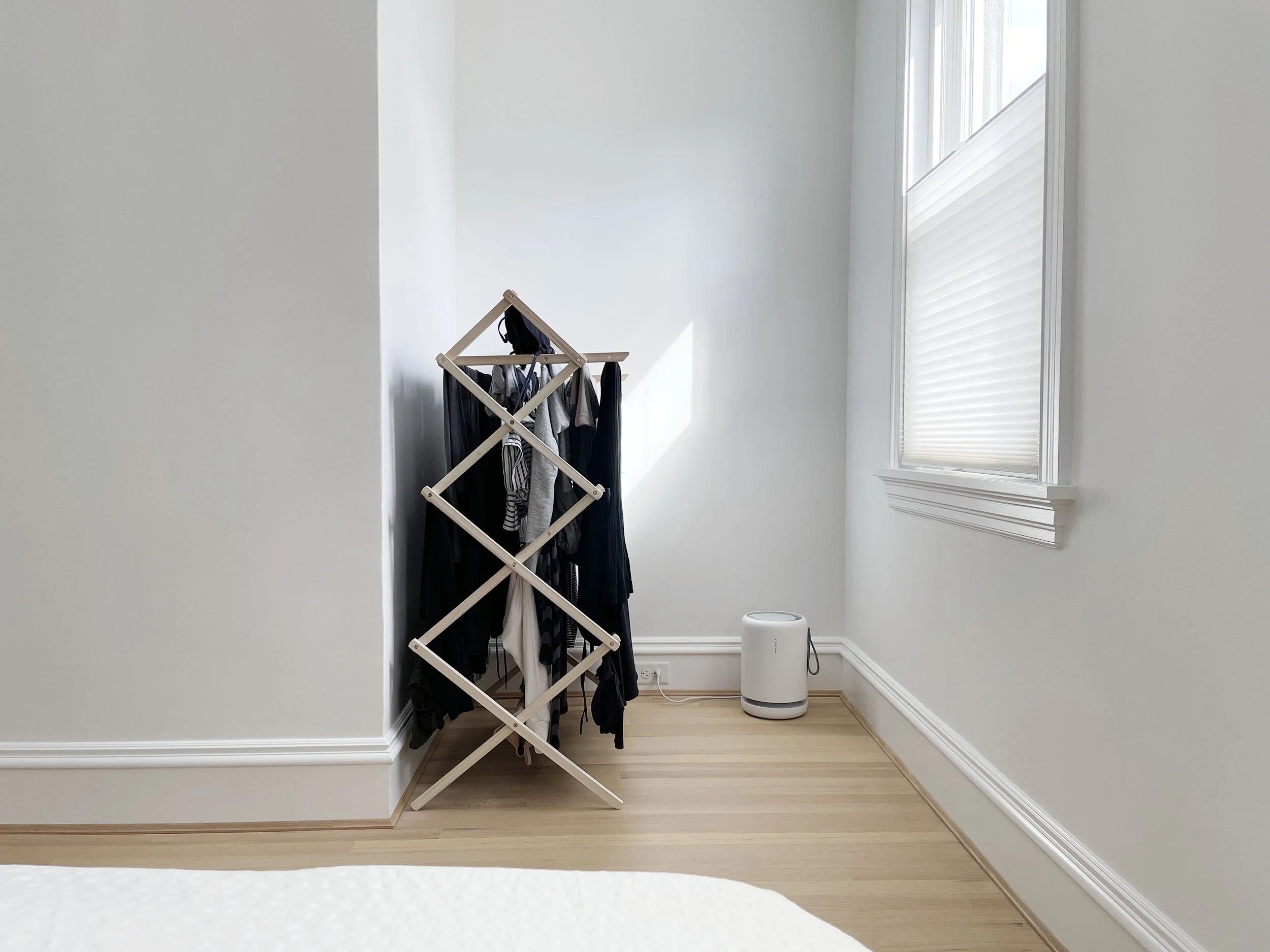 I use The Container Store’s 15-Dowel Wooden Clothes Drying Rack. I love the warm wood and the way it fits right into my space like a piece of furniture. You can collapse it and store under a bed or in a closet, but I leave mine up 24/7 by the window. It’s a great example of Minima’s mission statement in action—Make what is necessary beautiful.®—which is our way of describing the perfect harmony between form and function.