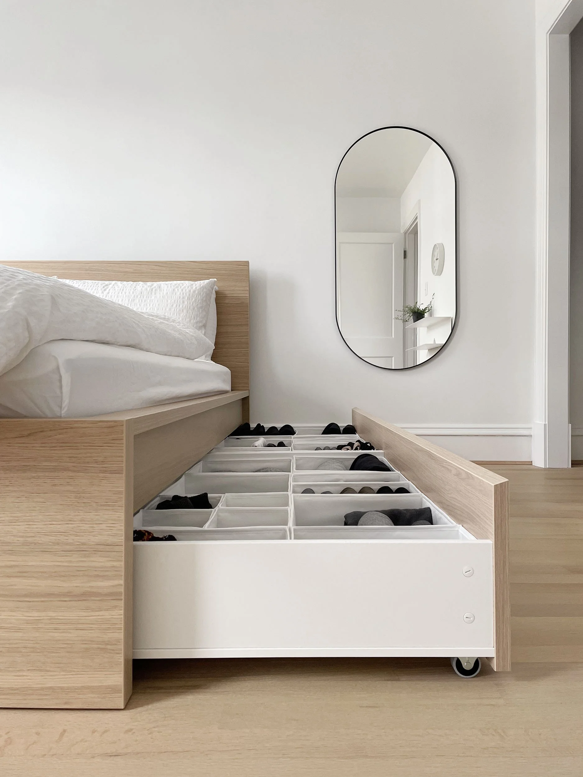 Instead of adding an additional (or larger) dresser, we decided a storage bed would be the perfect solution. We found the MALM high bed frame with four storage boxes in white stained oak veneer from IKEA and it has been so perfect—I’m obsessed with the way the real oak veneer blends into our oak flooring. It has four under-bed drawers and each individual drawer fits the same volume as my entire previous dresser. We’ve essentially quadrupled our storage without adding additional pieces of furniture in the room!