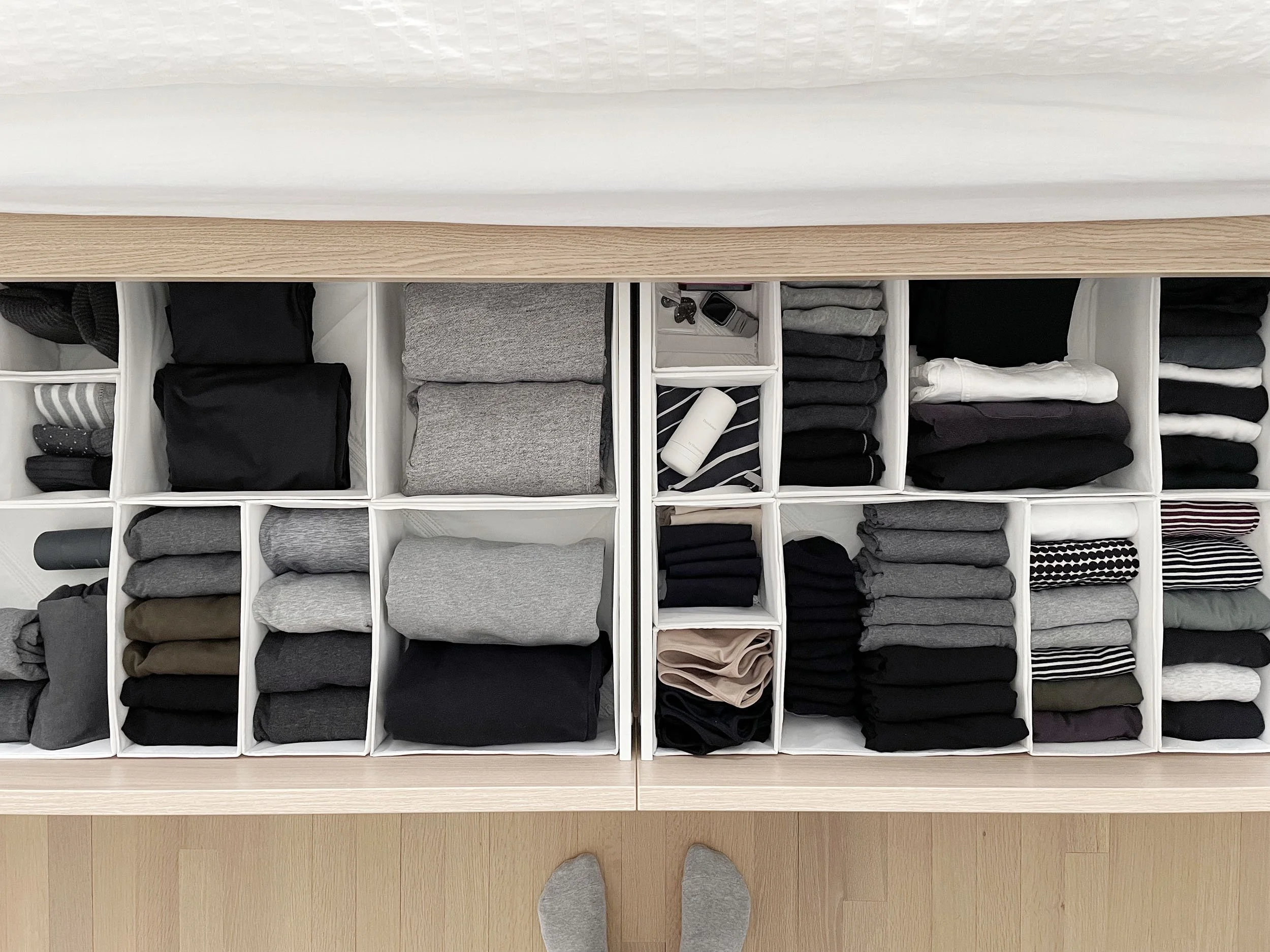 We use the two drawers on the right (facing the closet) for our folded clothing, and the two drawers on the left (facing the windows) for travel accessories, lint roller refills, the Kindle, and other bedroom accessories. We added the SKUBB boxes in white to create some separation since each drawer is so large.
