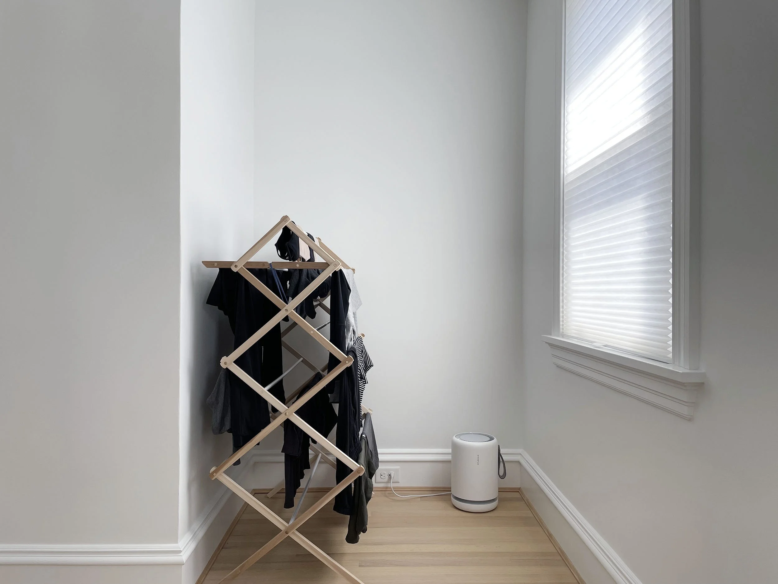 Speaking of laundry, that routine has changed a bit since we now have two wardrobes to keep clean instead of just mine. My husband and I have created a great system for dividing household chores. I do all the laundry and folding, as well as cleaning in between our monthly cleaning service. He does all of the grocery shopping, cooking, and dish washing. We share the maintenance of the exterior of our home, which is minimal since we’re in the Fan and don’t have much of a yard. Since there is more clothing to wash now, I run a load every other day and I leave our clothes drying rack up 24/7 in the small bedroom nook. Previously I had a plant on display by the window. To learn more about my laundry routine, check out “My Minimalist Laundry Routine”. Thinking outside the box and finding new ways to make space has kept this room a peaceful sanctuary for me and my husband. We love it!