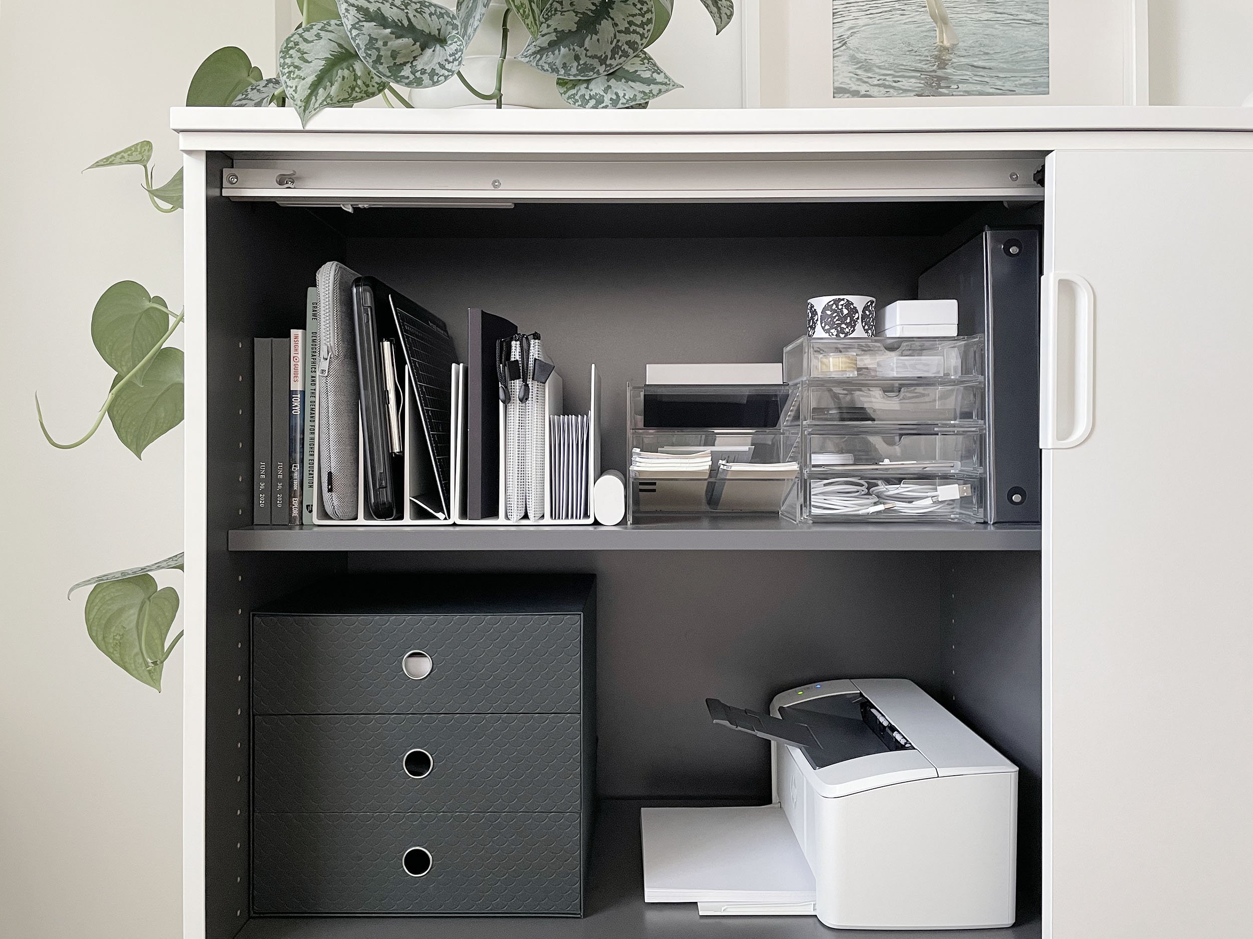 We still use IKEA’s GALANT cabinet with sliding doors for all of our storage needs. Fortunately he didn’t have much in terms of office supplies other than his laptop and a few charging cables. We purchased the ELLOVEN monitor stand with drawer for a few of his essentials. We each have a BEKANT height adjustable desk (55” wide x 24” deep) and matching Aeron chairs. IKEA’s EILIF screen divides our desks. His desk is at a higher setting (he’s 5’9”) while my desk is at the lowest setting (I’m just under 5’3”). Between the height adjustable desks and the ergonomic Aeron chairs (yes, they are life changing and totally worth it), we’ve both been very comfortable!